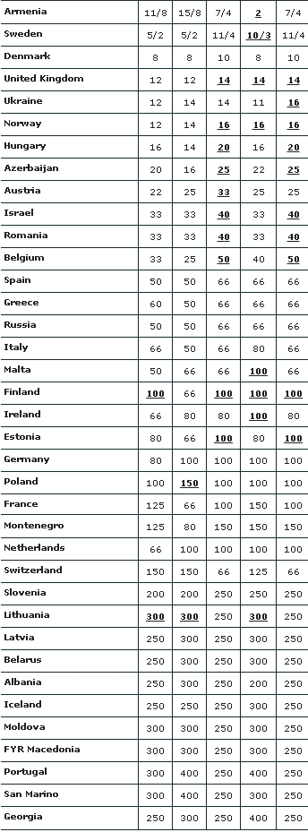 Sweden is part of my Fab Five and already has been firming in my mind as the likely winner. Sanna will leave the viewers mesmerised, and Sweden are a country that innately gather huge votes when their songs are good. Of the others in my Fab Five, Russia, Spain and Italy are at $50 or just over, with Estonia $80. Romania, who I predict will do well, are given a reasonable chance at $35.