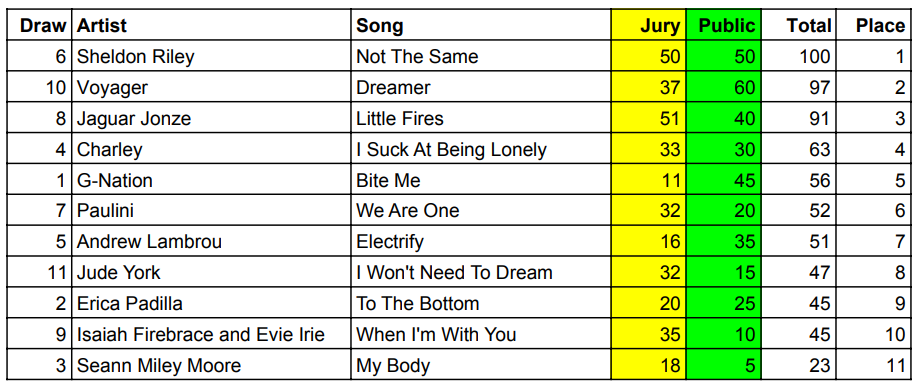 A final word on the voting: what the hell is the system? Instead of talking about voting at Eurovision, talk about your own voting system. While supposedly it was 50/50 between jury and public, there was no explanation why the public vote was in 5-point increments (60 for first, then 50, 45, 40, 35, down to 5) while the jury was precise values (51, 50, 37, 35, 33, 32, 32, 20, 18, 16 and 11). In fact, as a fan posted on twitter, if the jury vote was similarly split into 5-point increments, Voyager would have won. Voyager would get 45 points for third, Sheldon 50 points for second, Jaguar 60 points for first. Add that to their public vote of 60, 50 and 40 respectively, it’s Voyager 105, Sheldon 100 and Jaguar 100. Jaguar only finished fourth with the public, with G-Nation in third. Had she been the public’s third pick, Voyager would still win by being their first pick. I actually sensed with G-Nation’s large public vote, which was read first after they were last with the jury, that that would bite one of the favourites, most likely Jaguar Jonze, and sadly that was the case.
