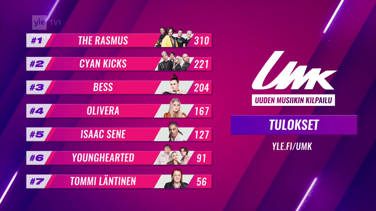 The jury was only worth 25% of the total vote, so were always unlikely to be much of impact. Even if The Rasmus got zero points from them, they still would have won such was their popularity with the public. They finished with a total of 310 points ahead of fellow rock entrant, Cyan Kicks, on 221 points. The upbeat, rock-tinged rapid pop entry from Bess was third on 204 points.