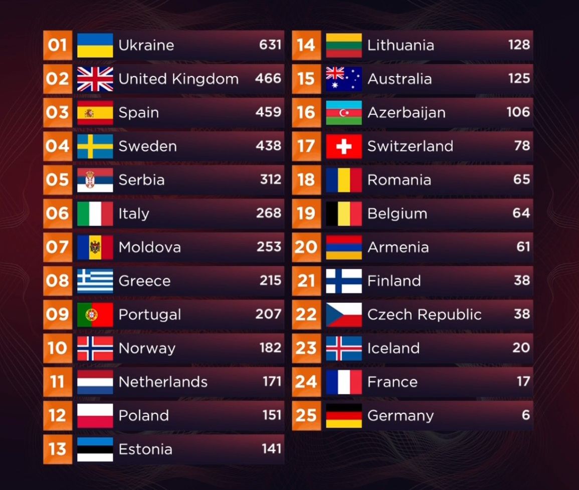 That 439 points for Ukraine from the public surely must be some sort of record. Italy scored only 318 points last year, Netherlands 261 in 2019 (Norway won the public vote with 291), Israel 317 in 2018, Portugal 376 in 2017 and Ukraine 323 (Russia 361) in 2016. As for the two big winners in the jury/public 50/50 era, Loreen for Sweden in 2012 got 343 points while Alexander Rybak for Norway got 378 points.