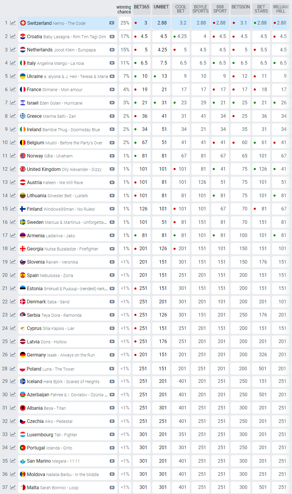 The betting market has been all over the place. Croatia, as one of the early songs released, jumped to huge favouritism until the market realised the juries probably won’t vote for them. So there’s been money for the likes of Italy, Switzerland and Netherlands, with Switzerland the favourite before rehearsals started. Croatia has held strong, and with so many fun songs this year, it’s actually unlikely to be a year like 2023 where Sweden’s Loreen accrued a massive jury vote to leave it impossible for the people’s favourite, Käärijä from Finland, to win. It’s more a year like 2018 where Austria and Sweden were the surprise top picks by the jury, and Israel (Netta with Toy) were able to win overall. I’m not sure Italy is actually that strong to be ranked fourth in the betting, while Ukraine is high due to sympathy again. Netherlands is a fan favourite and quite esoteric, so who knows. It could be one of those fun songs that the jury likes.