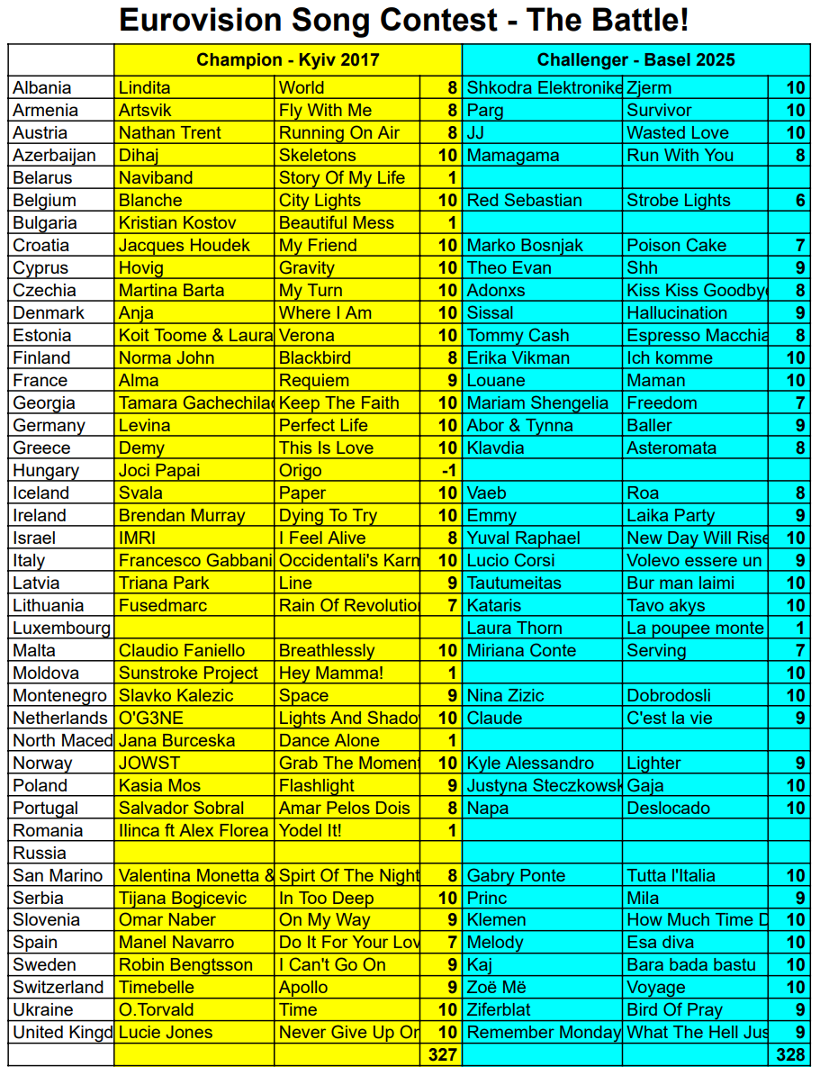 As 2025 draws to a close, the time is upon us for the annual Eurovision Song Contest Battle. This is where the reigning champion faces off in direct battle against the current year’s challenger. The inaugural battle was in 2017 when Kyiv 2017 just beat Stockholm 2016 by two points. Since then, Kyiv 2017 has beaten every challenger, and often quite comfortably. While 2017 isn’t regarded as a strong Eurovision, it proved to be an even one, barring a few horrible entries. That consistency has been the difference. There’s also a few songs that I particularly like that many others wouldn’t. Countering that, those horrible songs are really horrible and often suffer huge defeats. There’s also several other weak entries, meaning 2017 often starts in serious deficit.